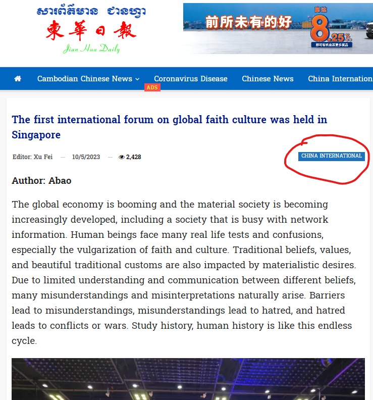 The First International Forum on Global Faith and Culture will be held in Singapore